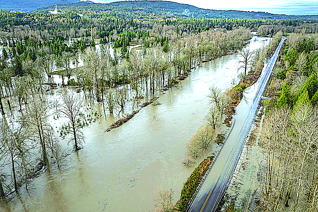 A highway near Fall City, Wash., is closed after being flooded by the Snoqualmie River, Tuesday, Dec. 9, 2025. (Ken Lambert/The Seattle Times via AP)