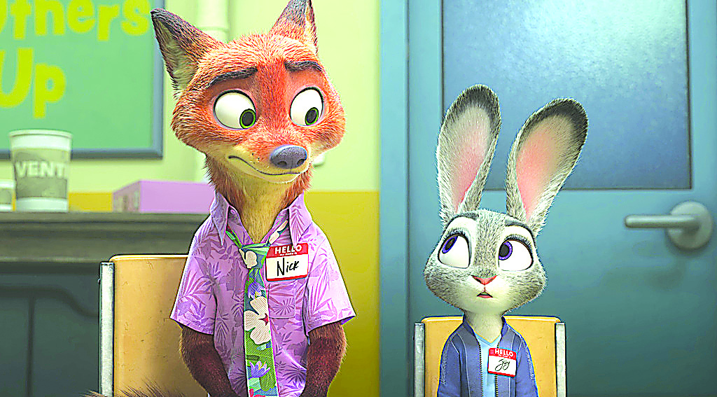 This image released by Disney shows Nick Wilde, voiced by Jason Bateman, left, and Judy Hopps, voiced by Ginnifer Goodwin, in a scene from "Zootopia 2." (Disney via AP)