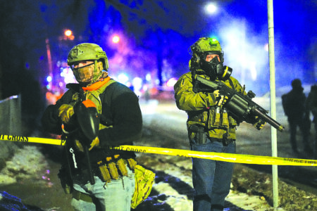 Law enforcement officers at the scene of a reported shooting Wednesday, Jan. 14, 2026, in Minneapolis. (AP Photo/Adam Gray)
