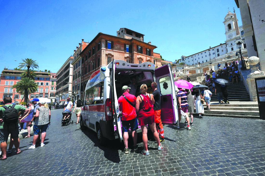 FILE - Paramedics provide aid to tourists and residents with an ambulance, next to the historical Spanish Steps, in Rome, Italy, July 1, 2025. (AP Photo/Andrew Medichini, File)