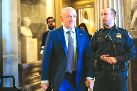Sen. Mark Kelly, D-Ariz., exits the Senate chamber after speaking out against Defense Secretary Pete Hegseth's efforts to censure him over his participation in a video that called on troops to resist unlawful orders, at the Capitol in Washington, Monday, Jan. 12, 2026. (AP Photo/J. Scott Applewhite)