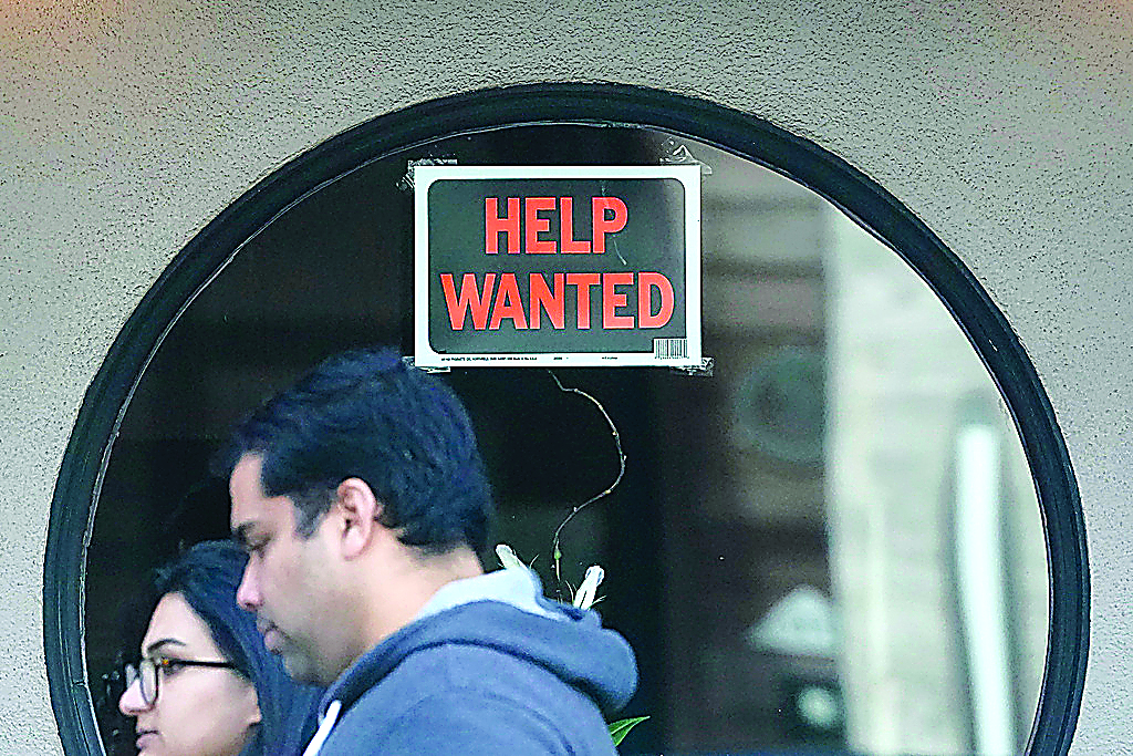 FILE - Pedestrians walk past a help wanted sign posted on the door of a restaurant in San Francisco, Tuesday, April 18, 2023. (AP Photo/Jeff Chiu, File)