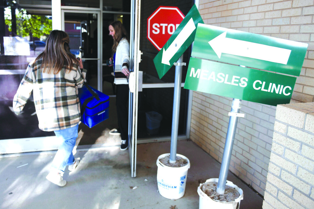 FILE - Health department staff members enter the Andrews County Health Department measles clinic carrying doses of the measles, mumps and rubella vaccine, Tuesday, April 8, 2025, in Andrews, Texas. (AP Photo/Annie Rice, File)