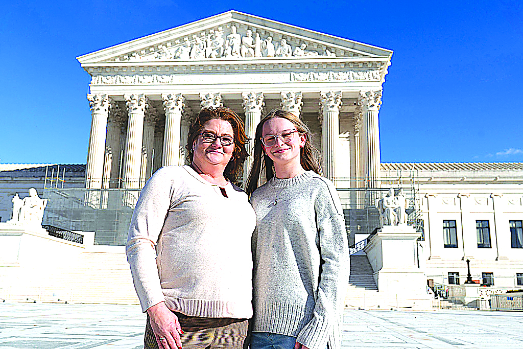 Heather Jackson, left, and Becky Pepper-Jackson pose for a photograph outside of the U.S. Supreme Court in Washington, Sunday, Jan. 11, 2026. (AP Photo/Jose Luis Magana)