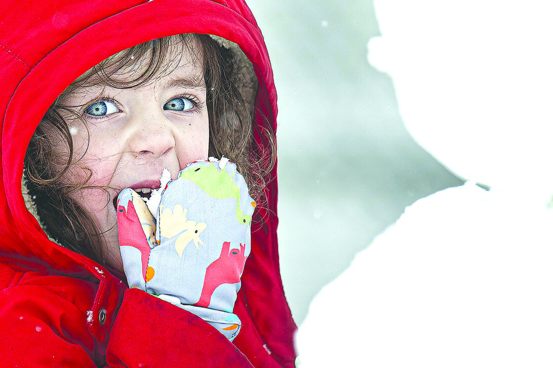 Louise Jordan, 3, eats snow while building a snowman near her home in Media, Pa. on Monday, Feb. 23, 2026. (Jose F. Moreno/The Philadelphia Inquirer via AP)