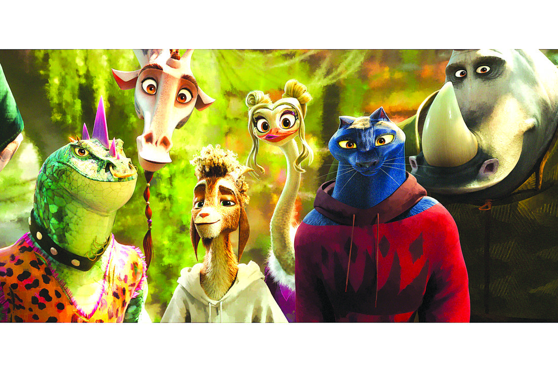 This image released by Sony Pictures shows characters, from left, Modo, voiced by Nick Kroll, Lenny, voiced by Stephen Curry, Will, voiced by Caleb McLaughlin, Olivia, voiced by Nicola Coughlan, Jett, voiced by Gabrielle Union, and Archie, voiced by David Harbour, in a scene from the animated film "GOAT." (Columbia Pictures and Sony Picture Animation via AP)