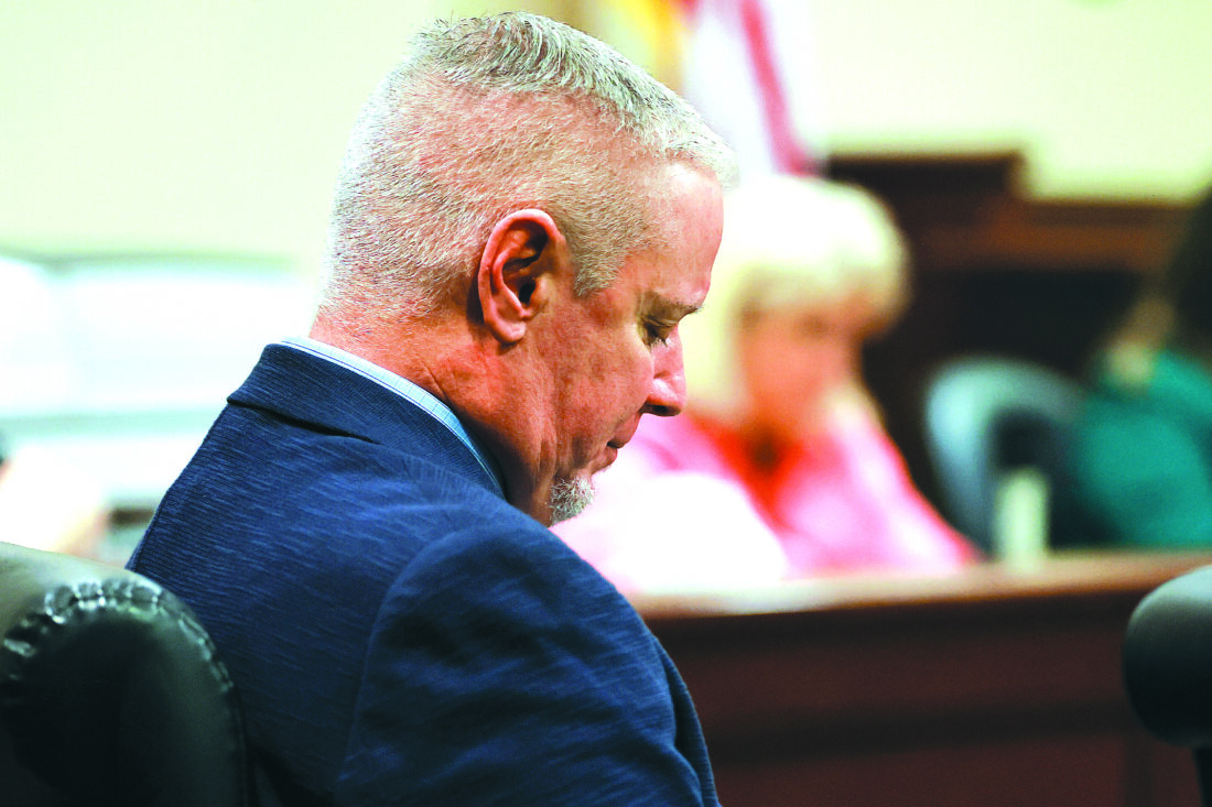 Colin Gray, the father of Apalachee High School shooting suspect Colt Gray, looks down as his attorney gives his opening statement in the courtroom at the Barrow County courthouse, Monday, Feb. 16, 2026, in Winder, Ga. (Jason Getz/Atlanta Journal-Constitution via AP)