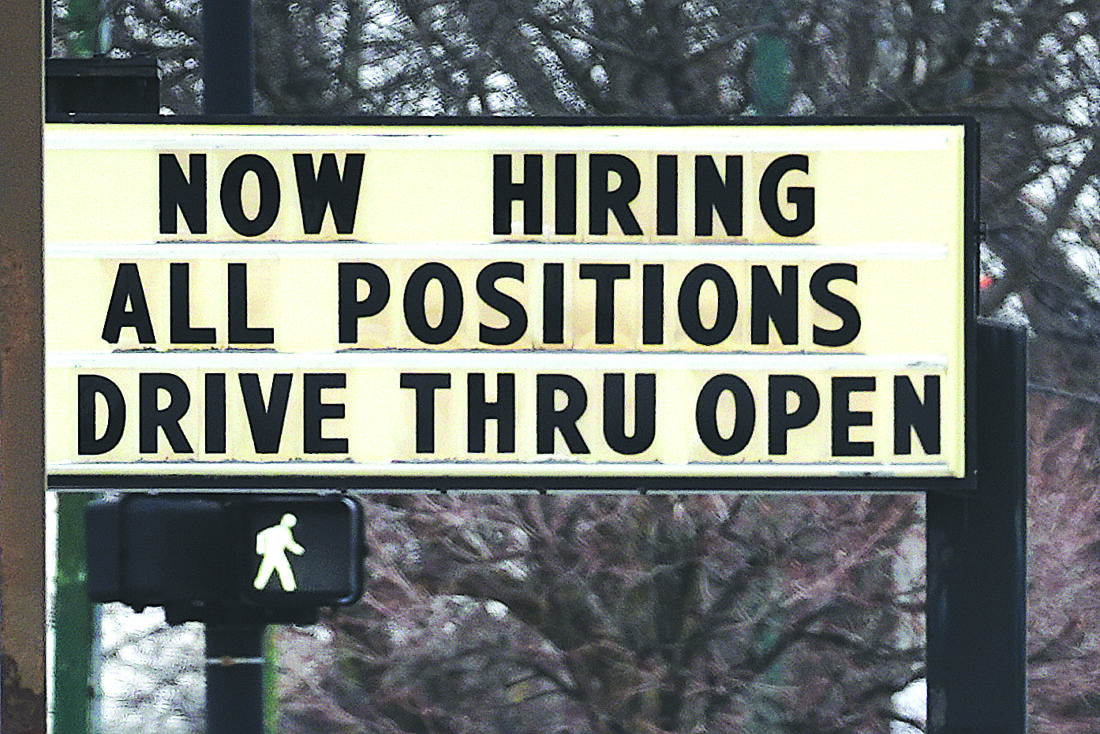 Hiring sign is displayed in front of a restaurant in Chicago, Thursday, Feb. 5, 2026. (AP Photo/Nam Y. Huh)