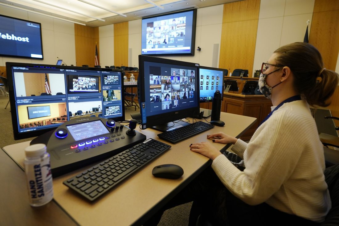 ADVANCE FOR RELEASE MARCH 14, 2021, AND THEREAFTER - FILE - In this Feb. 10, 2021, file photo, Carmen Senski, monitors a Zoom meeting of the Virginia House Appropriations Committee at the Capitol in Richmond, Va. A year after COVID-19 triggered government shutdowns and crowd limitations, more public bodies than ever are livestreaming their meetings for anyone to watch from a computer, television or smartphone. But in some cases, it's become harder for people to actually talk with their elected officials. (AP Photo/Steve Helber, File)