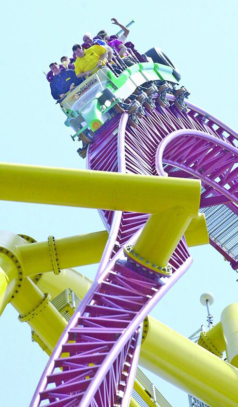 A year after its debut, four riders were slightly injured when metal shavings sheared off the coaster’s launch cable.