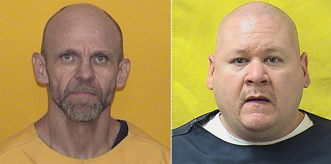 This combo made from photos provided by Ohio Department of Rehabilitation and Correction shows from left, Bradley Gillespie and James Lee. One of two inmates who escaped from an Ohio prison was captured early Wednesday, May 24, 2023 in Kentucky after a police pursuit of a stolen car the men were believed to be in ended in a crash and a foot chase, authorities said. Lee was captured at the scene but Gillespie remained at large. (Ohio Department of Rehabilitation and Correction via AP)