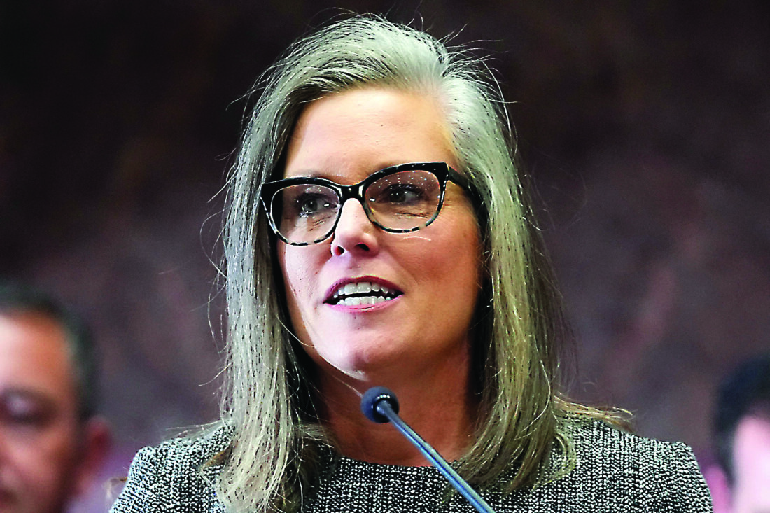 FILE - Arizona Gov. Katie Hobbs delivers her state of the state address at the Arizona Capitol in Phoenix on Jan. 9, 2023. Joshua Russell, of Bucyrus, Ohio, was sentenced Monday, March 25, 2024, in federal court in Phoenix, to two and a half years in prison for his conviction for making an interstate threat against then-Arizona Secretary of State Katie Hobbs during the 2022 campaign season. Russell Had acknowledged making death threats in three voicemails left for Hobbs, who at the time was Arizona's chief election officer and now serves as Arizona's governor. (AP Photo/Ross D. Franklin, File)