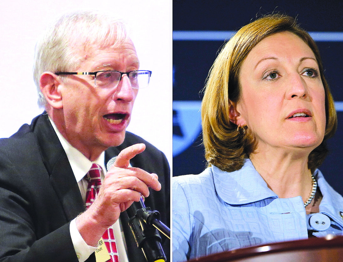 FILE - In this photo combo Ohio Supreme Court justice Pat Fischer, left, speaks during the Fairfield County Lincoln Republican Club banquet in Pickerington, Ohio, March 24, 2022 and then-Ohio Secretary of State Jennifer Brunner answers a question during a debate at the City Club of Cleveland, April 13, 2010, in Cleveland. (AP Photo/Paul Vernon, Tony Dejak, file)