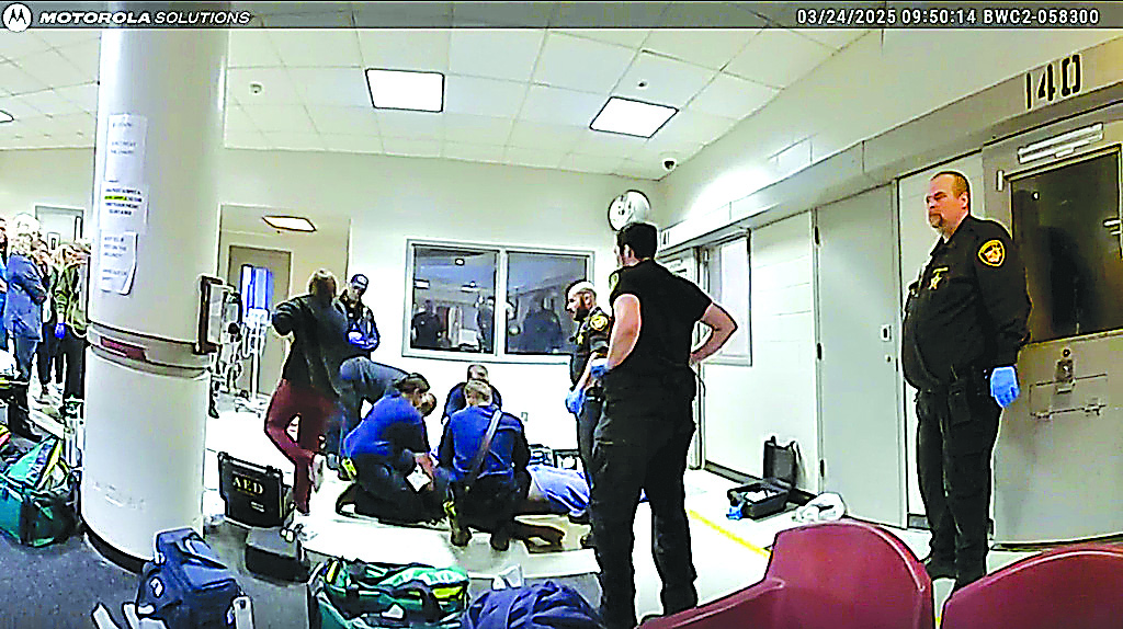 This image taken from video released by the Montgomery County Sheriff's Office shows law enforcement giving aid to Christian Black inside Montgomery County Jail on March 24, 2025 in Dayton, Ohio. (Montgomery County Sheriff's Office via AP)