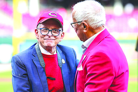 FILE - Hall of Fame broadcaster Marty Brennaman, right, speaks with Ohio Gov. Mike DeWine, left, during "Marty Brennaman Day" prior to a baseball game between the New York Mets and the Cincinnati Reds, Saturday, Sept. 6, 2025, in Cincinnati. (AP Photo/Jeff Dean, File)