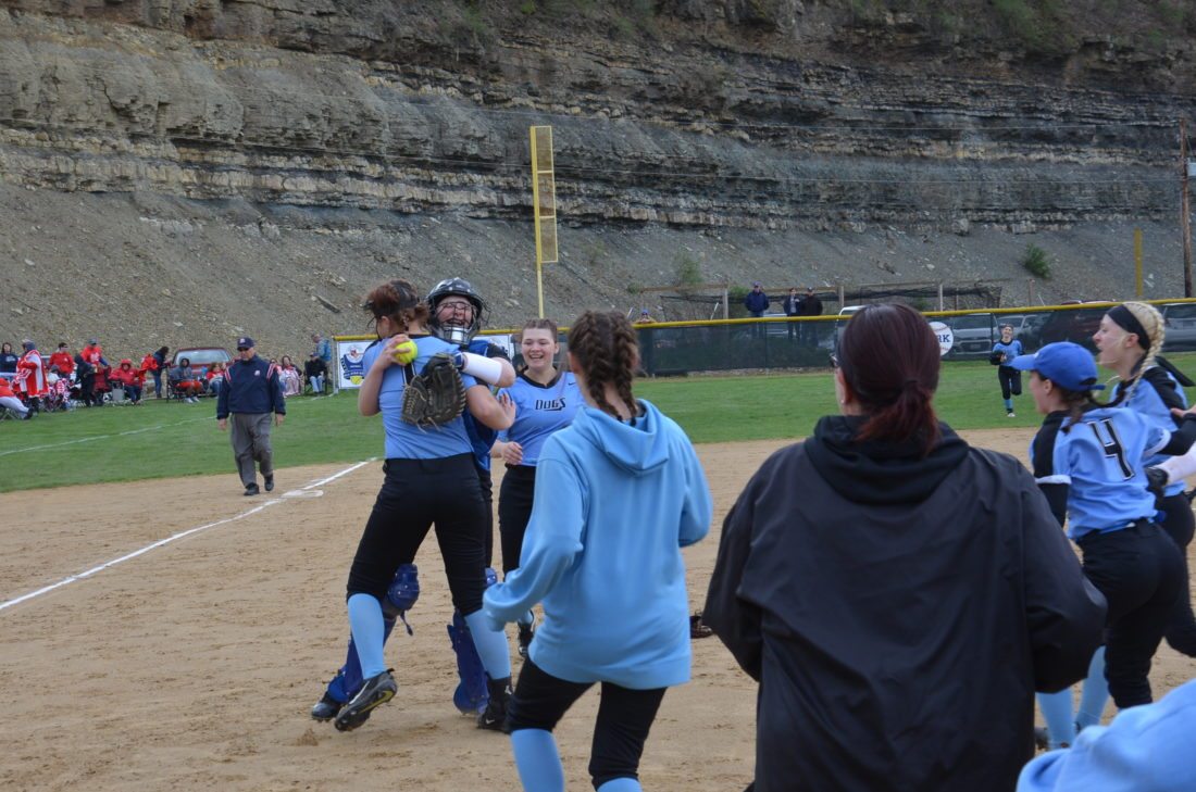 Bridgeport catcher Danielle Hollingshead and pitcher Brooklynn Ruble embrace after recording the final out in Saturday’s OVAC Class 2A final in Elm Grove. Also pictured is Briana Conaway, who is the third baseman.