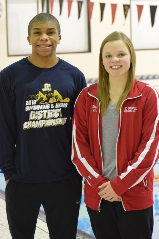 PICTURED ARE returning state qualifiers Jarrett Bolinger of Martins Ferry and Maggie Marody of St. Clairsville. Both are multiple-time OVAC champions and sectional champions as well. Marody advanced to swim in the ‘B’ final at the OHSAA State Championship meet in Canton as part of the 500 freestyle last season.