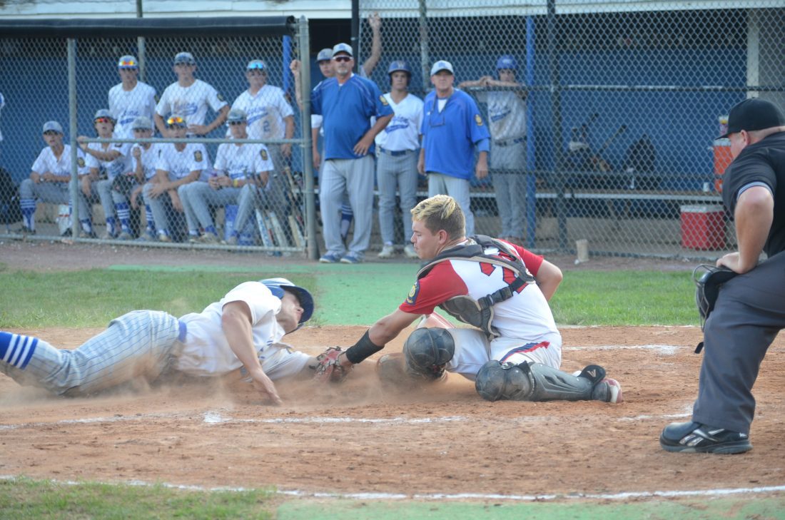 T-L File Photo/KIM NORTH ST. CLAIRSVILLE American Legion Post 159 catcher Jakob Jarvis applies a tag during a game at Cambridge last summer. Ohio American Legion baseball announced that it is planning a regular season, district and state tournaments. When practices can begin has yet to be determined.