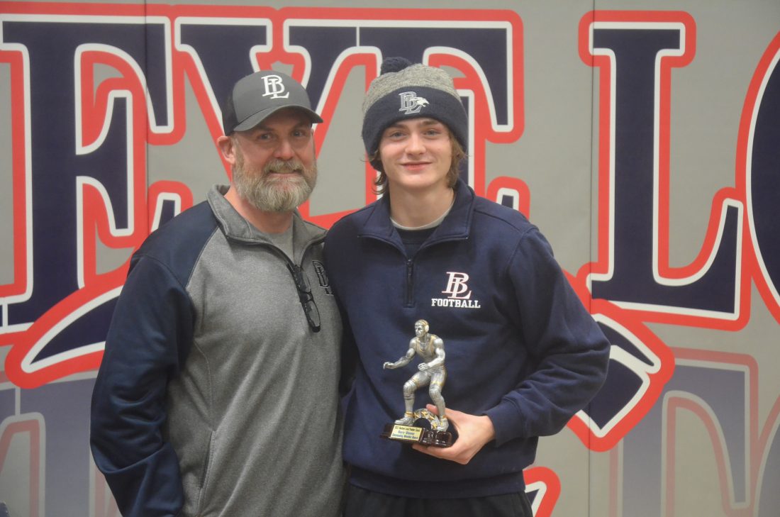 BUCKEYE LOCAL’S Trevor Herbert, right, is presented with the Gary Glover Most Outstanding Wrestler Award following his performance Saturday during the 33rd annual Ohio Coatings Panther Classic inside Buckeye Local High School. Competing for the first time this season due to knee surgery, Herbert won the 120-pound weight class with four consecutive pins. Also pictured is Greg Glover, son of Gary Glover.