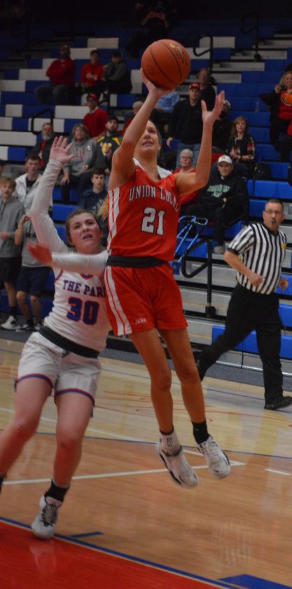 Photo/CODY TOMER Union Local’s Torre Kildow attempts the last shot of the game as time expires with Wheeling Park’s Alexis Bordas defending. The junior finished with 42 points for the Jets.