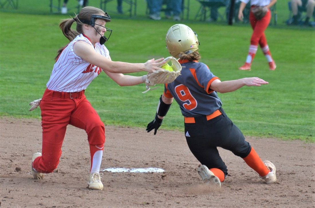 T-L Photo/KIM NORTH UNION LOCAL shortstop Emily Kellaway fields a throw from catcher Marissa McGary as Linsly’s Gia Recrosio (9) avoids the tag while stealing second base during Friday’s game at Holloway Field in Wheeling. The Cadets picked up a 7-1 victory over the Jets.