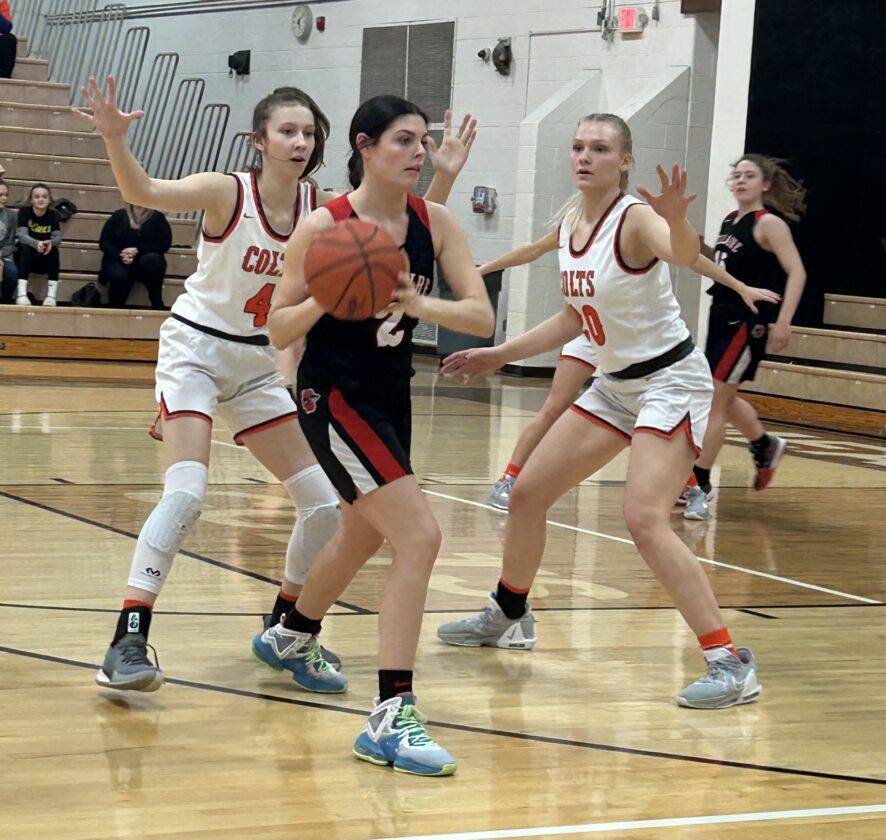 A “triple” by Kenli Norman ended the Lady Colts’ dry spell and Kaylynn Gombeda followed with a close-range goal at the two-minute mark to push the lead to seven, 44-37, and neither team scored the rest of the way thanks to a rash of miscues.