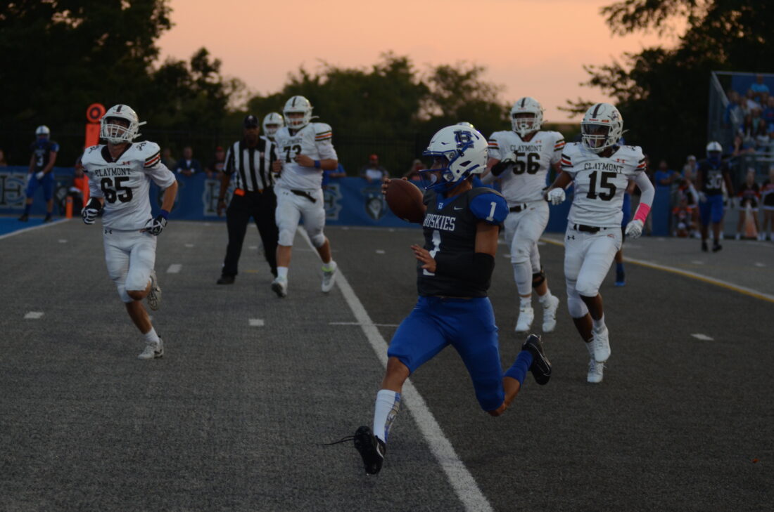 Photo by Andrew Grimm The Huskies’ Hayden Cassidy rushes towards the endzone past Claymont defenders on a 10-yard scoring run.
