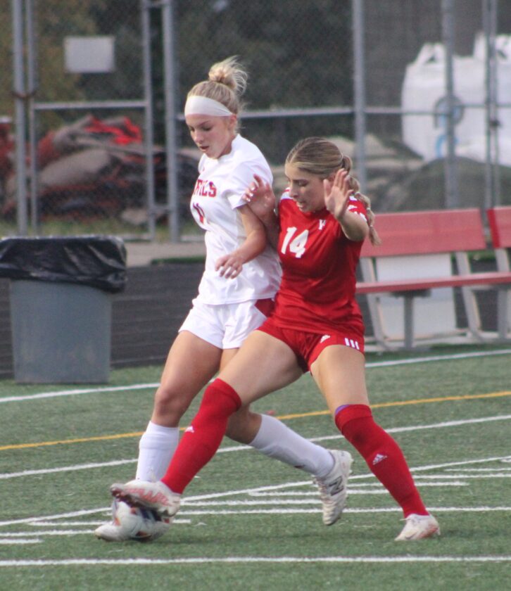 Photo by Mike Hughes Weir’s Catherine Glodowski (12) tries to shield St. C. midfielder Delaney Florence from the ball during Wednesday night’s OVAC Class 4A semifinal at Jimmy Carey Stadium in Weirton. The Red Riders won, 3-0.