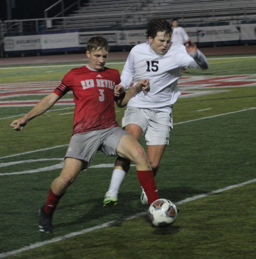 Photo by Mike Hughes St. Clairsville’s Parker Galloway and Cambridge’s Aidan Castello fight for the ball during the sectional contest Monday at Red Devil Stadium.