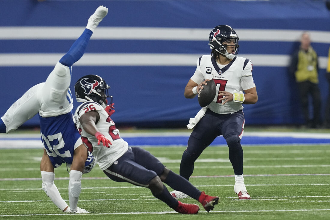 Houston Texans quarterback C.J. Stroud (7) prepares to throw a pass against the Indianapolis Colts during the first half of an NFL football game Saturday, Jan. 6, 2024, in Indianapolis. (AP Photo/Darron Cummings)