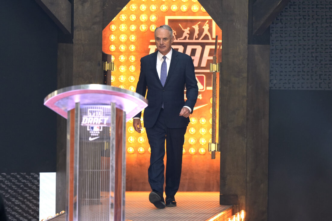 Major League Baseball Commissioner Rob Manfred walks up to the podium during the MLB baseball draft in Fort Worth, Texas, Sunday, July 14, 2024. (AP Photo/LM Otero)
