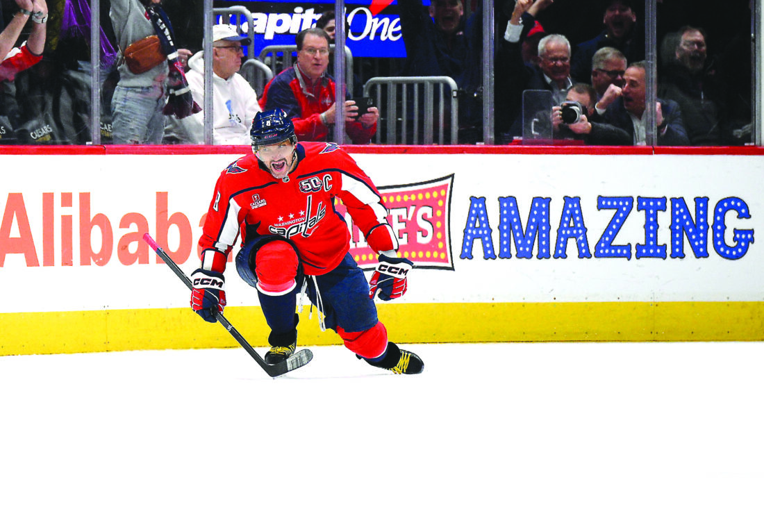 WASHINGTON (AP) — Alex Ovechkin fired a perfect wrist shot past Calvin Pickard for his first goal of the game, scored from his office on the power play for his second and sailed a shot into an empty net from his own zone to complete the hat trick.