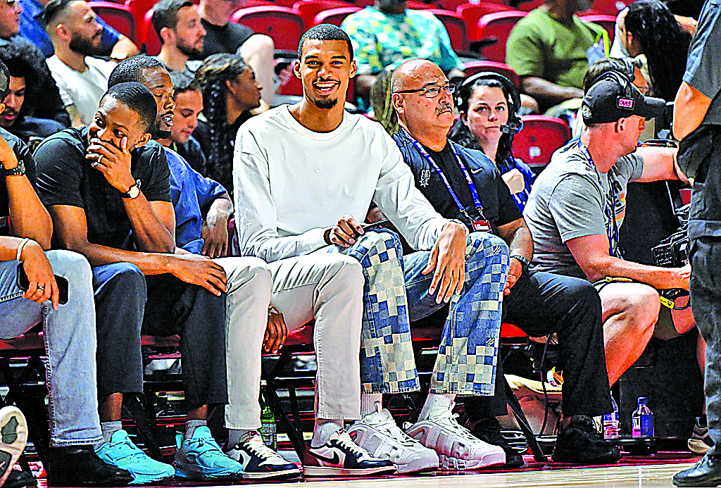 San Antonio Spurs' Victor Wembanyama, center, sits court side during the first half of an NBA summer league basketball game between the Spurs and Philadelphia 76ers, Thursday, July 10, 2025, in Las Vegas. (AP Photo/David Becker)
