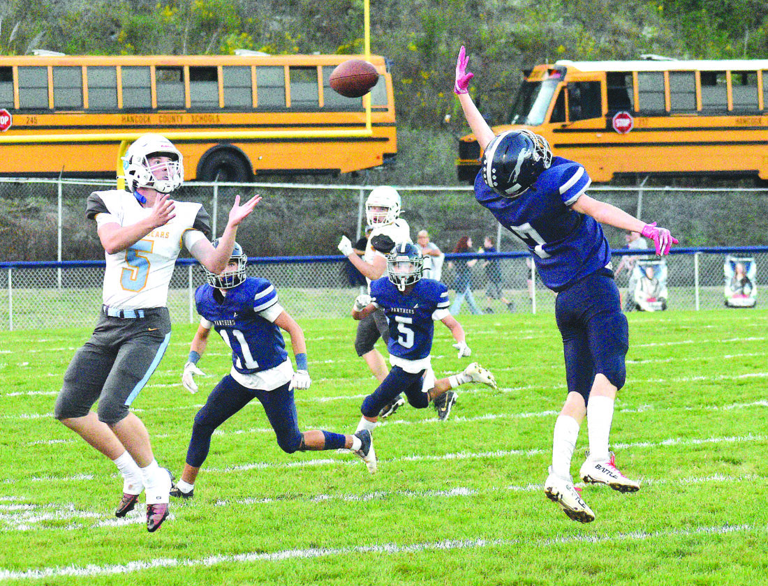 Photo by Kim North Oak Glen’s Josh Maher (5) awaits a pass as Buckeye Local’s Jonas Eddy (7) leaps high trying to deflect the ball while the Panthers’ Daniel Divjak (11) and Izaiah Hundley (5) close in during action Friday night from World War II Memorial Stadium in Yorkville. The Golden Bears posted a 17-0 shutout.