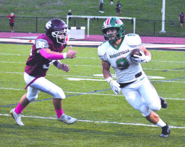 Photo by Kim North Barnesville’s Koby Jones (9) runs with the ball as Wheeling Central’s Trenton McCardle (36) defends Thursday night at Wheeling University’s Bishop Schmitt Field. Jones ran for 138 yards and two touchdowns as the Shamrocks rolled to a 43-14 victory over the Maroon Knights.