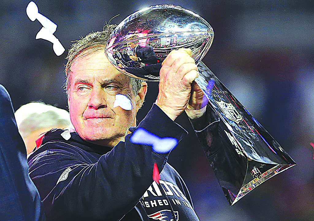FILE - New England Patriots head coach Bill Belichick holds up the Vince Lombardi Trophy as he celebrates after the Patriots defeated the Seattle Seahawks 28-24 in NFL Super Bowl XLIX football game Sunday, Feb. 1, 2015, in Glendale, Ariz. (AP Photo/Patrick Semansky, File)