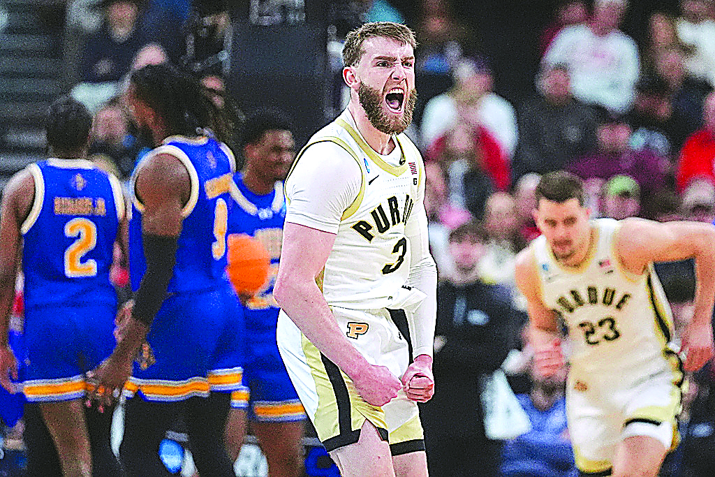 FILE - Purdue guard Braden Smith (3) celebrates while taking a lead against McNeese State during the first half in the second round of the NCAA college basketball tournament, Saturday, March 22, 2025, in Providence, R.I. (AP Photo/Charles Krupa, File)