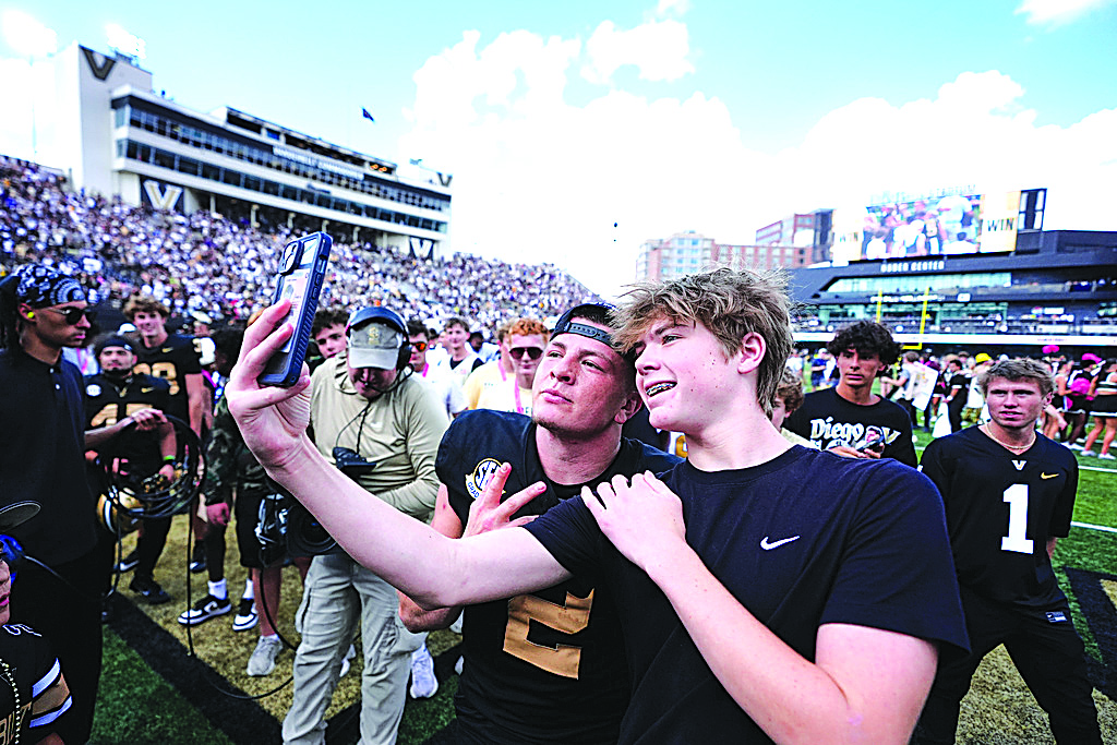 Vanderbilt quarterback Diego Pavia (2) poses with a fan after the team's win after an NCAA college football game against LSU, Saturday, Oct. 18, 2025, in Nashville, Tenn. (AP Photo/George Walker IV)
