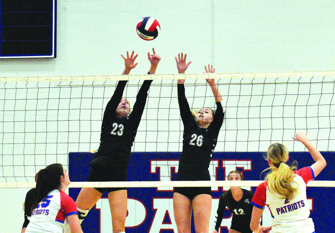Photo by Kim North Martins Ferry’s duo of Nicole Hammerquist (23) and Lexi Carte (26) leap high for the ball Tuesday night as Wheeling Park’s Tiarah Sutphin (25) and Hallie Lawson (7) look on during action inside the ‘Palace on the Hill.’ The Purple Riders claimed a sweep by scores of 25-13, 25-14 and 25-22.