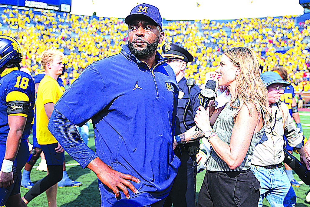 Michigan head coach Sherrone Moore gives a news interview after the team's win in an NCAA college football game against Wisconsin, Saturday, Oct. 4, 2025, in Ann Arbor, Mich. (AP Photo/Ryan Sun)