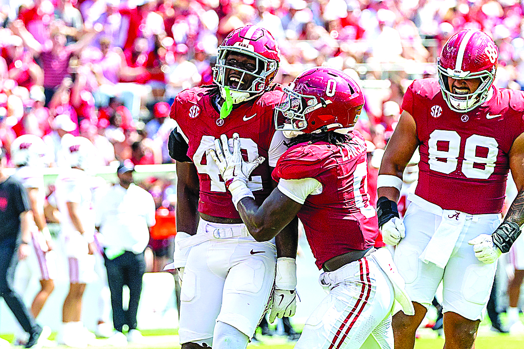 Alabama linebacker Yhonzae Pierre (42) celebrates a sack with Alabama linebacker Deontae Lawson (0) during the second half of an NCAA college football game against Wisconsin, Saturday, Sept. 13, 2025, in Tuscaloosa, Ala. (AP Photo/Vasha Hunt)