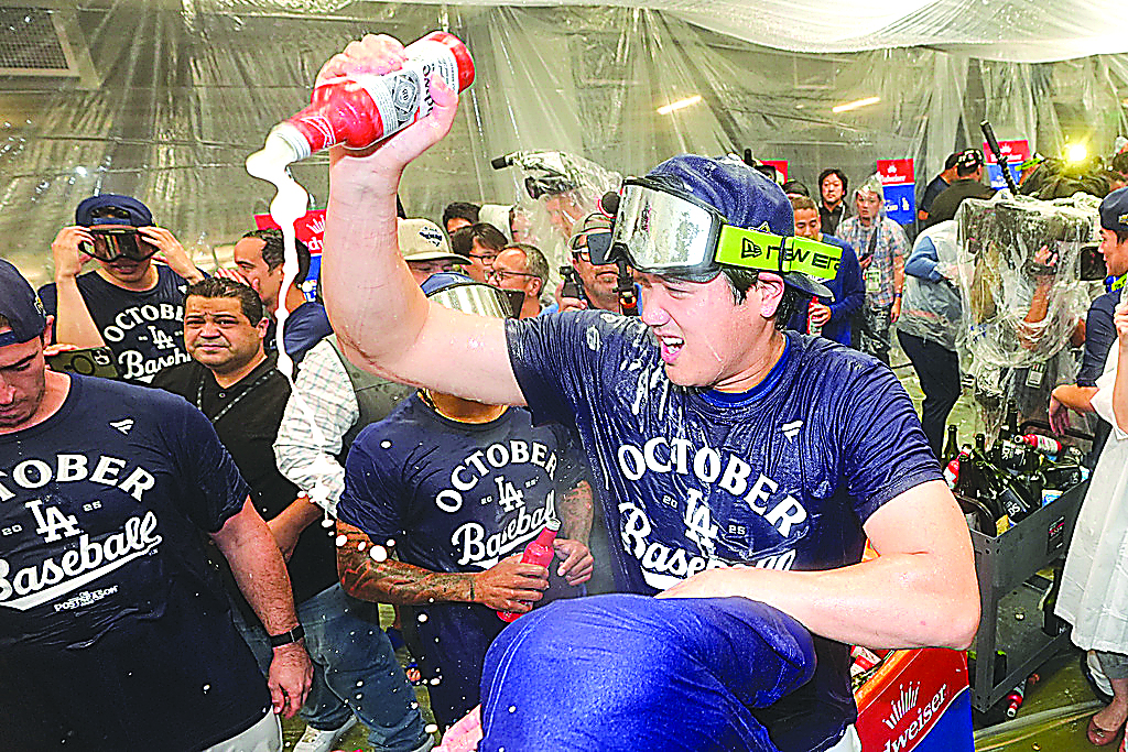 Los Angeles Dodgers' Shohei Ohtani, right, celebrates in the clubhouse after a win over the Cincinnati Reds in Game 2 of the National League Wild Card baseball playoff series Wednesday, Oct. 1, 2025, in Los Angeles. (AP Photo/Mark J. Terrill)