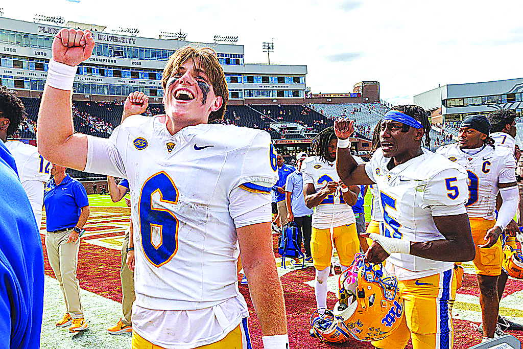 Pittsburgh quarterback Mason Heintschel (6) celebrates with teammates after they defeated Florida State in an NCAA college football game, Saturday, Oct. 11, 2025, in Tallahassee, Fla. (AP Photo/Colin Hackley)