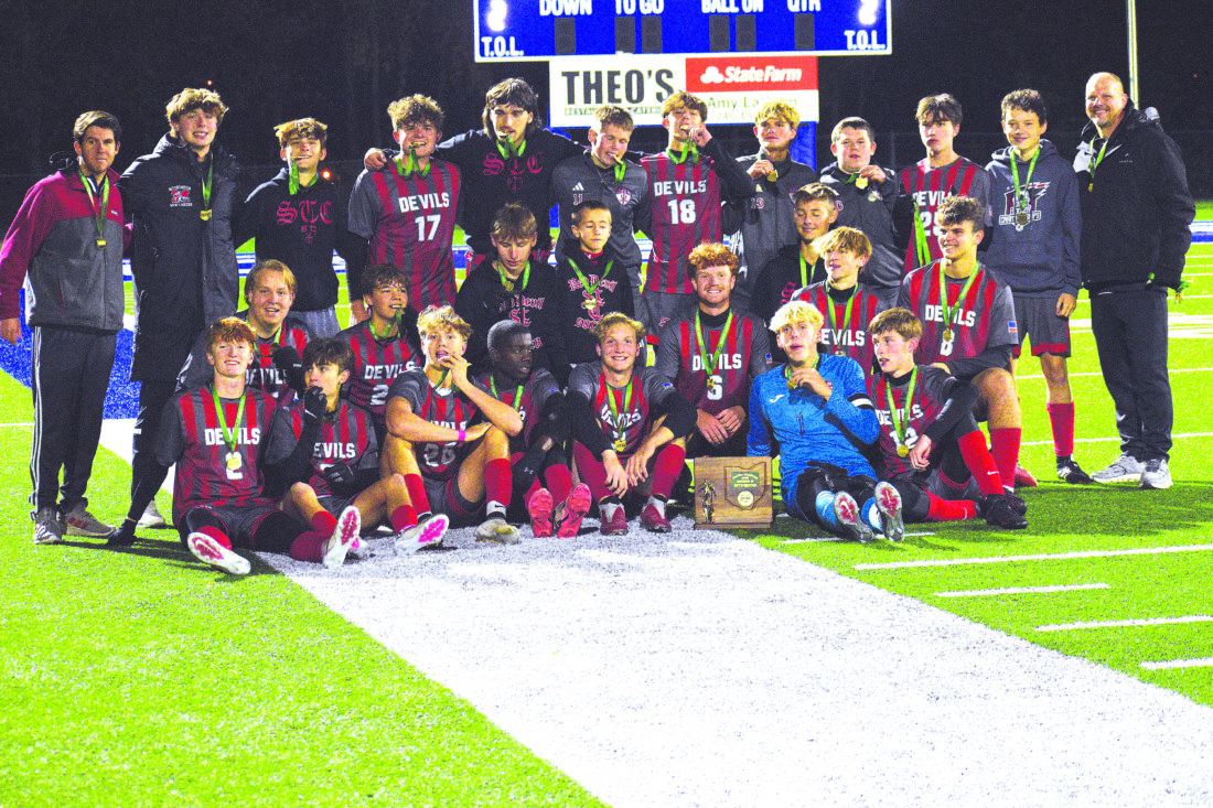Photo by Kim North The St. Clairsville boys’ soccer team is pictured with their Ohio Division IV Eastern District 1 Championship Trophy after defeating West Muskingum 3-1 Thursday night at McFarland Stadium in Cambridge. The Red Devils play River View next Wednesday back in Cambridge in a Region 13 semifinal.