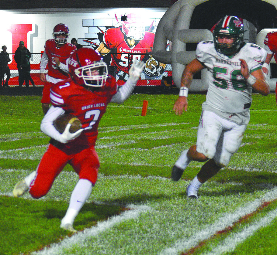 Brody Perzanowski, Union Local’s all-time leading rusher and rushing touchdowns, was hemmed up. The junior picked up 73 yards on 22 carries.