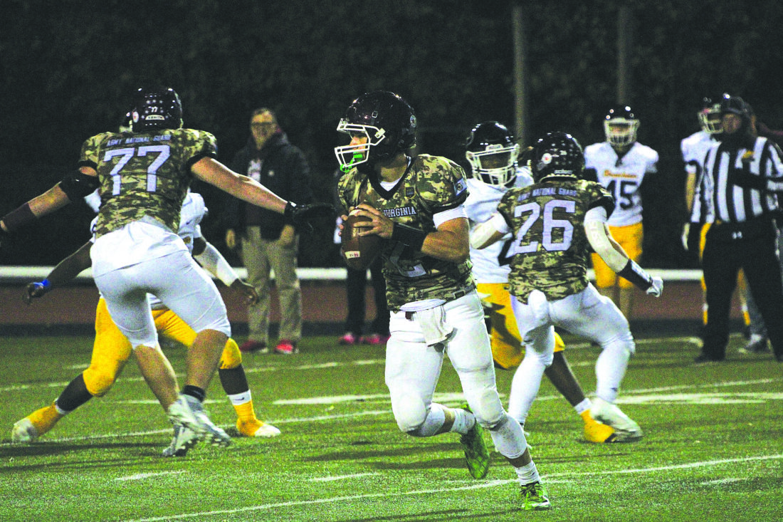 Photo by Nick Henthorn Wheeling Central’s Nico Kusic looks for a pass Friday against the Brashear Bulls on Bishop Schmitt Field in the Maroon Knights’ 48-20 homecoming victory.