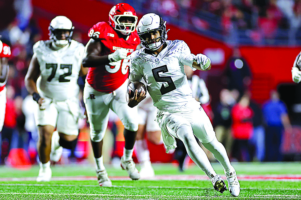 Oregon quarterback Dante Moore (5) runs with the ball during the second half of an NCAA college football game against Rutgers, Saturday, Oct. 18, 2025, in Piscataway, N.J. (AP Photo/Adam Hunger)