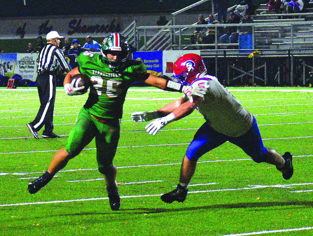 Photo by Kim North Barnesville’s Trey Toliver stiff arms a would-be Portsmouth tackler during last week’s 34-0 rout in the opening round of the Ohio Division V, Region 19 playoffs. Toliver, who scored three touchdowns in the contest, and the Shamrocks travel to Wheelersburg Friday night in a regional semifinal.