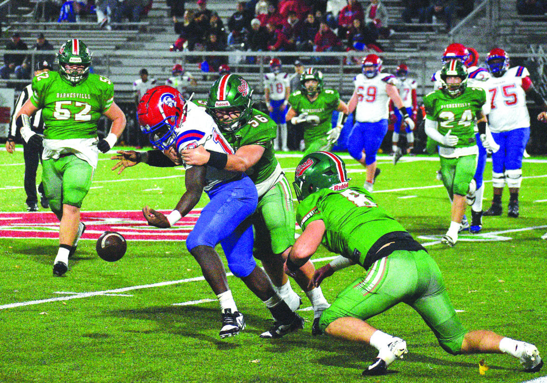Photo by Kim North Barnesville’s Christien Hannahs (56) causes Portsmouth’s Fernando Poxes (10) to fumble in the first quarter Friday night during their Ohio Division V, Region 19 quarterfinal playoff game at Shamrock Stadium. The Shamrocks’ Phoenix Graham eventually recovered the loose ball as Barnesville cruised 34-0. Barnesville’s Hines Ford (8) is also pictured.
