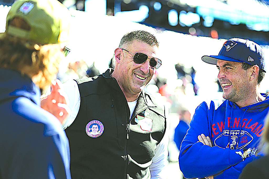 New England Patriots head coach Mike Vrabel speaks with PGA golfer Keegan Bradley before an NFL football game between the New England Patriots and the Atlanta Falcons, Sunday, Nov. 2, 2025, in Foxborough, Mass. (AP Photo/Robert F. Bukaty)